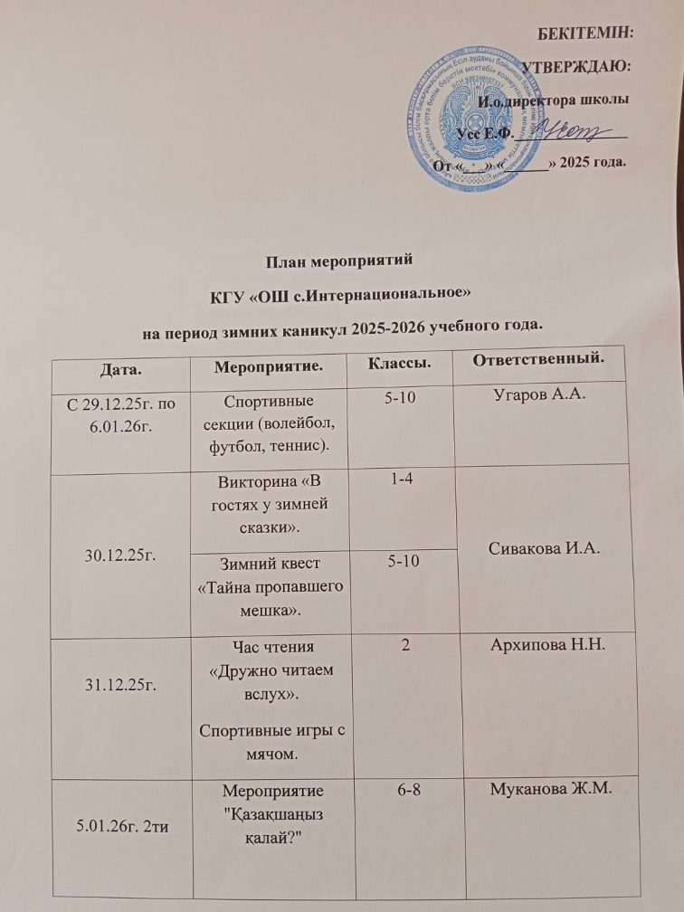 2025-2026 оқу жылының қысқы каникул уақытында КМУ «Интернациональдық ауыл ОМ» мекемесінде іс-шаралар өткізіледі.